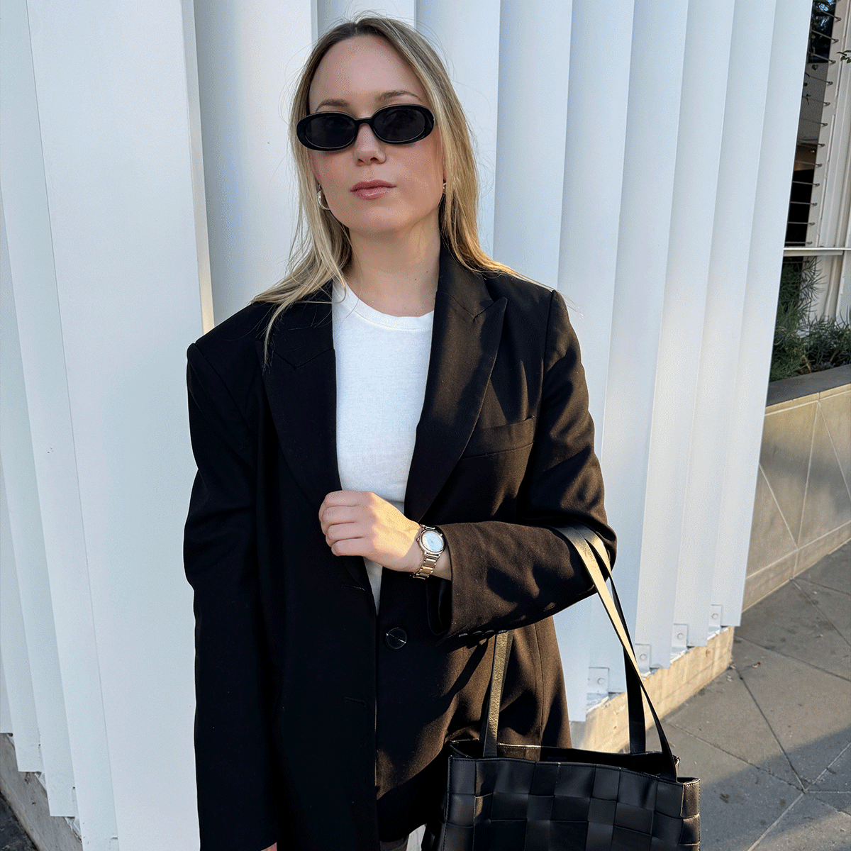 Though Michaela and I don’t go into the office all the time, when we do, we like to dress up. So I wasn’t surprised to see her wearing the Arcly watch, the newest addition to Citizen’s women’s collection. The rose-gold metal is stunning, plus the watch has a touch of diamonds that just make it that much more extra (in the best way). “On this day, I wanted to feel really elevated,” Michaela told me. “I went for a blazer, accessories, black kitten heels, and my rose-gold watch. The bracelet strap of the watch combined with the less common metal color is all just very chic and polished. Plus, I’ve discovered that wearing a watch to the office means I won’t be late for any meetings.”