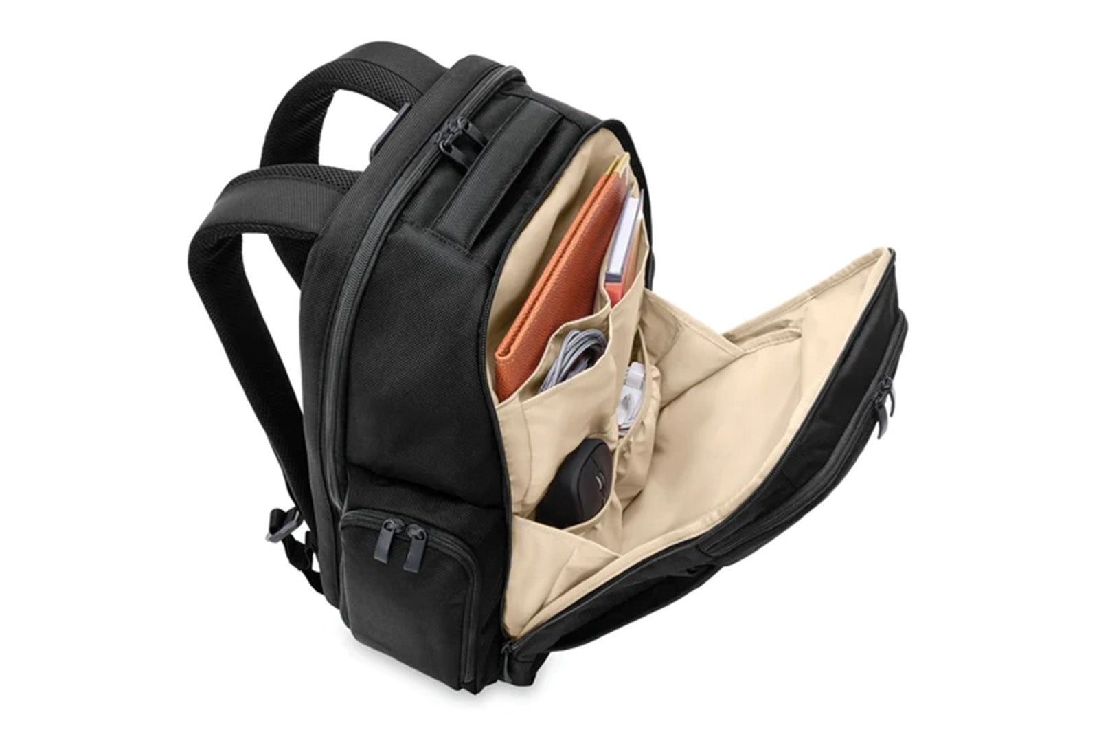 As far as business-travel backpacks go, Aer’s is certainly quite stylish. It comes in three colors (black, navy and olive), and it’s made of sustainable materials without compromising on durability. A separate laptop compartment safeguards your most precious technology, while the main compartment is large enough for all your chargers and other travel accessories.
