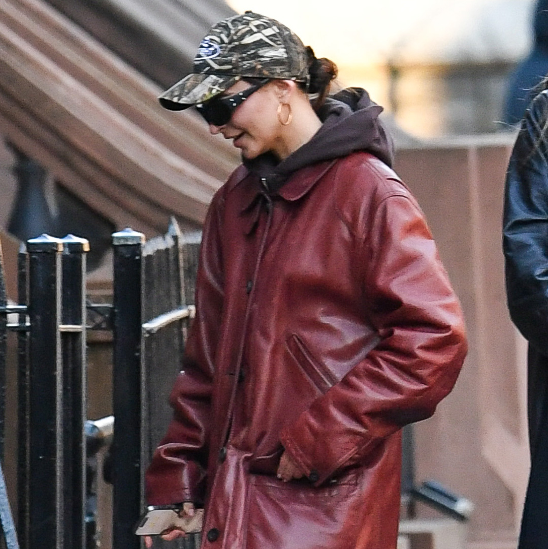 The sneakers I’m referring to are Puma Speedcat OG Sneakers, the retro suede style that first made its debut over 25 years ago. The latest to wear the sneakers is Emily Ratajkowski, who wore the black pair with a burgundy leather jacket, baseball cap, and trousers this week in NYC. But it was just the most recent of the many times she’s worn them (in every color) in recent months. Other celeb fans are Rihanna, Jennifer Lawrence, and Dua Lipa.