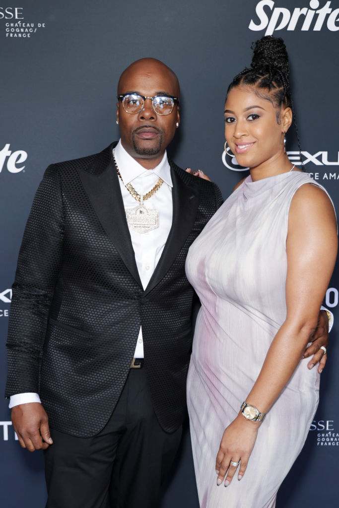 BEL AIR, CALIFORNIA – FEBRUARY 04: (L-R) Memphis Bleek and Ashley Cox attend 2023 Roc Nation The Brunch at Private Residence on February 04, 2023 in Bel Air, California. (Photo by Momodu Mansaray/Getty Images for Roc Nation) vertical,photography,people,arts culture and entertainment,usa,music,california,two people,three quarter length,bel air,brunch,memphis bleek,residential building