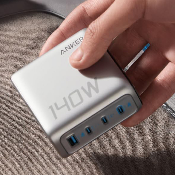 Anker’s latest GaN charger features an integrated display and four USB ports on the underside of the device, as opposed to the side, which helps keep it in place while charging.