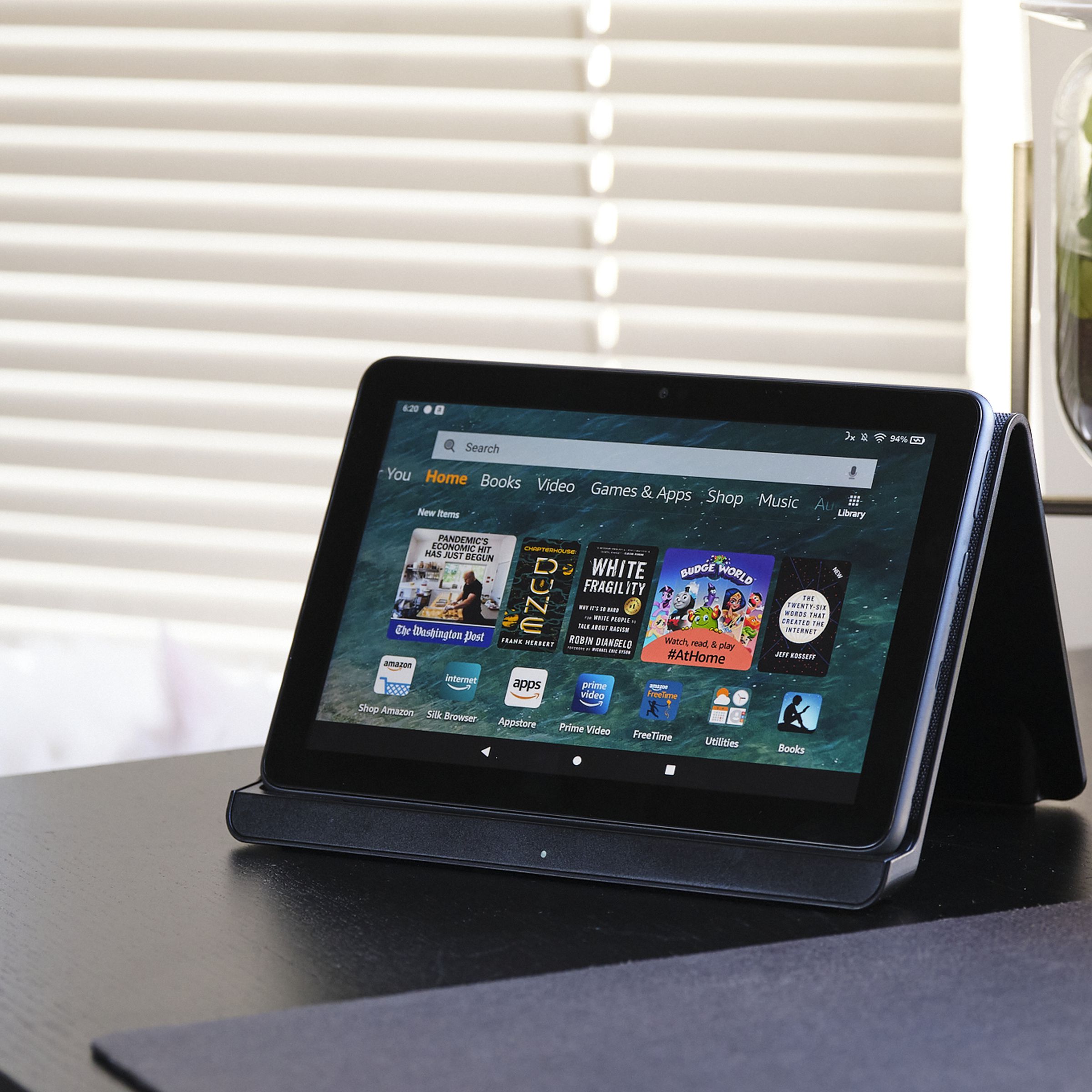 The Amazon Fire HD 8 Plus propped up in Show Mode