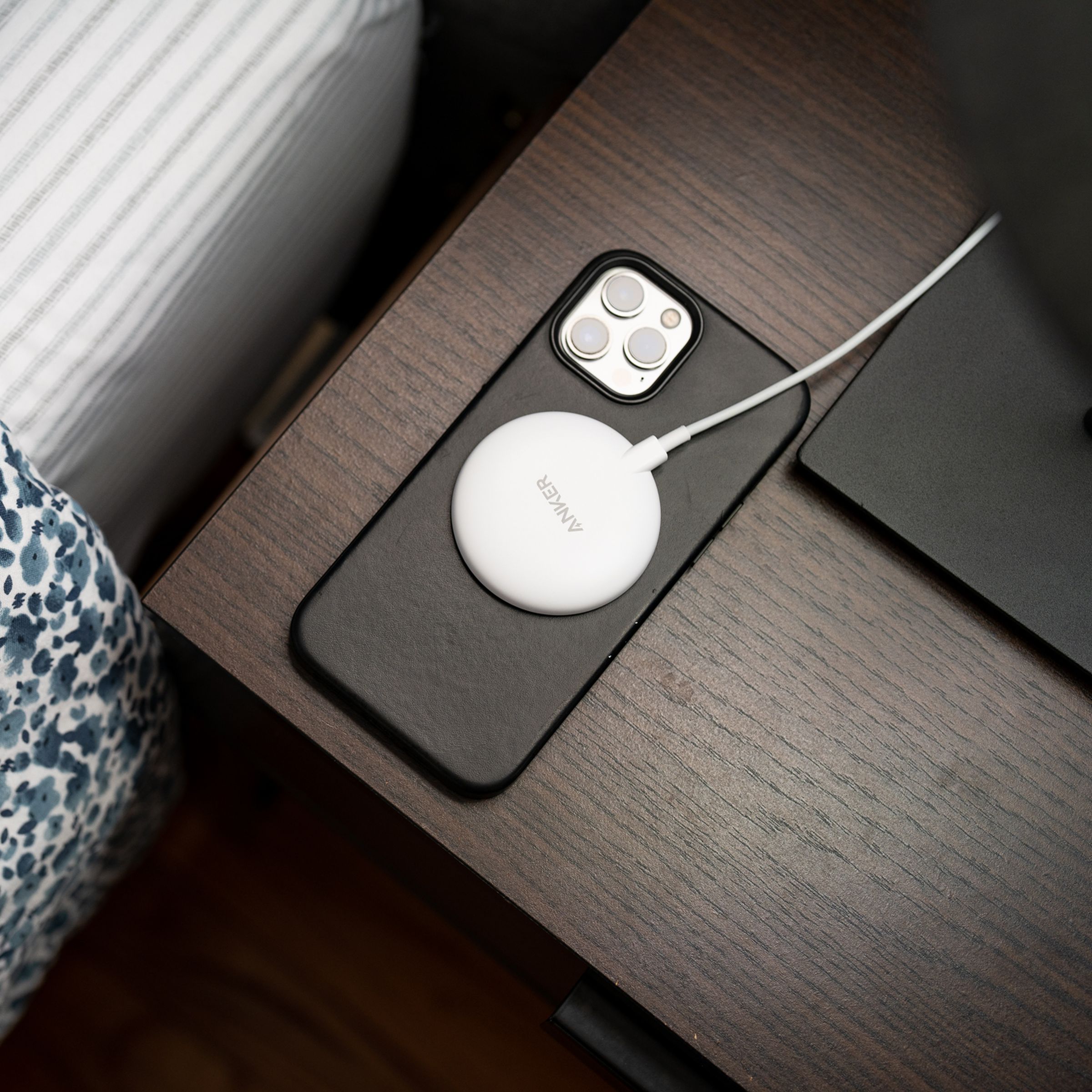 This Anker magnetic charging puck has a five-foot USB-C cable and wirelessly charges an iPhone at up to 7.5W.