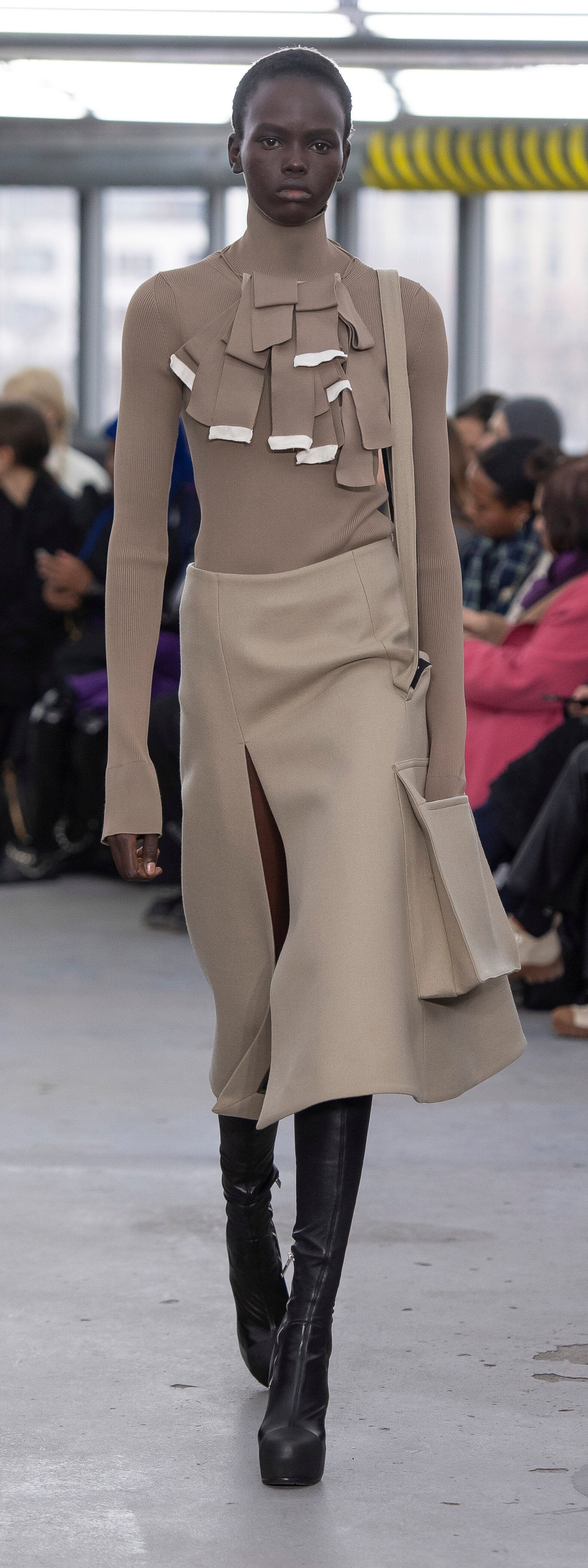 Have you ever wished you could hike up your long skirt or coat for day, and let it down when the moment arrived? Presenting the skirt strap (at Loewe). Or the parka strap (at Hermès). Worn over one shoulder à la handbag, but attached to the hem of a garment — or to an enormous pocket that acts like a handbag (at Sacai) — the straps allow the wearer to customize the length of their outfit: the epitome of an incredibly obvious, very smart innovation we can’t believe no one has thought of before. — Vanessa Friedman