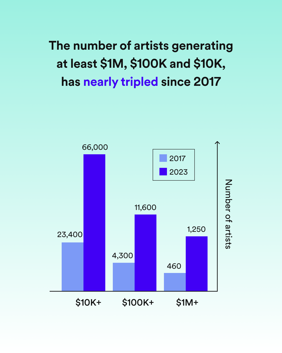 Spotify royalties are powering artists’ careers at all stages. And these figures only represent revenue generated from Spotify. Artists likely generated 4x this revenue from recorded music sources overall, plus additional revenue from concert tickets and merch.
