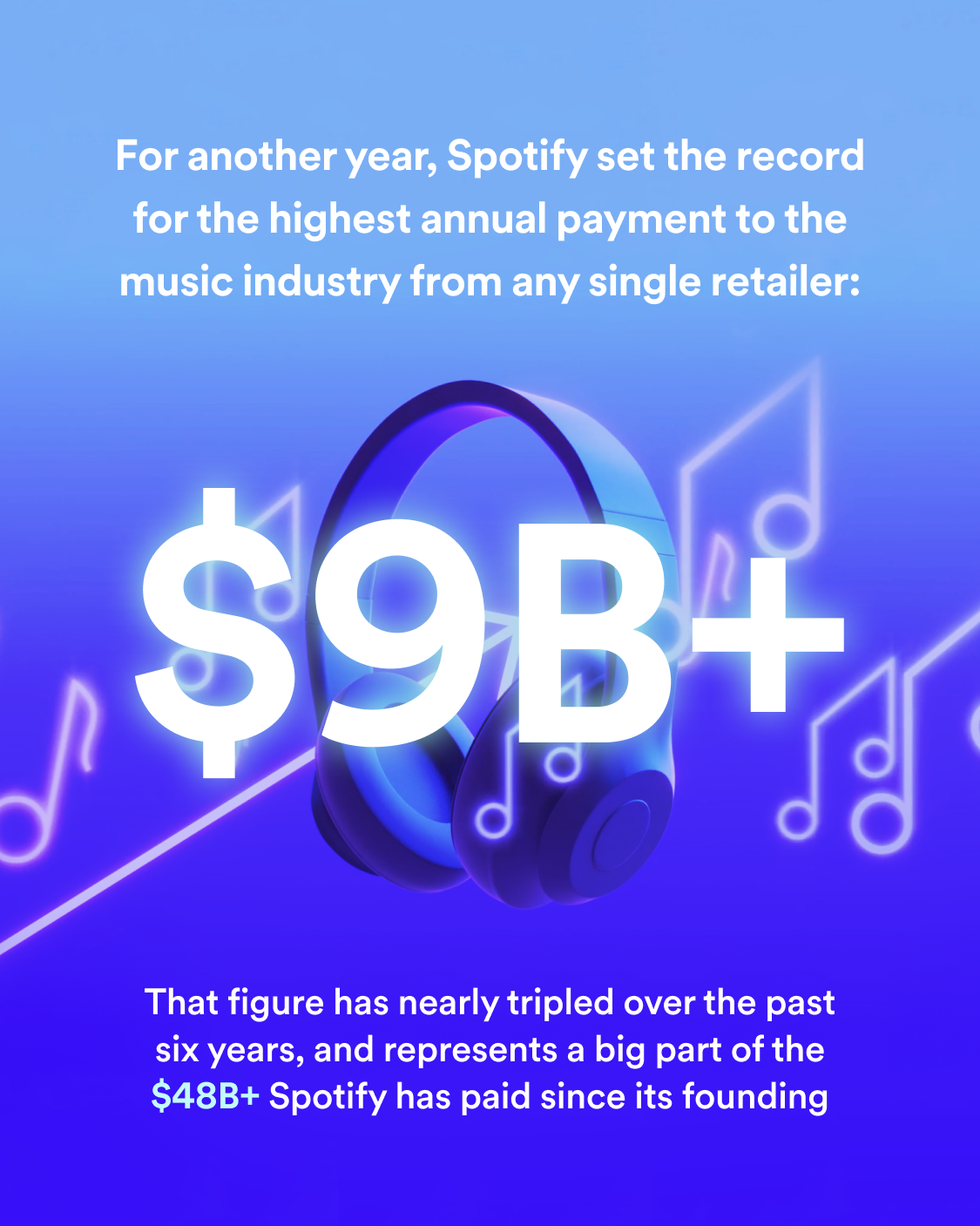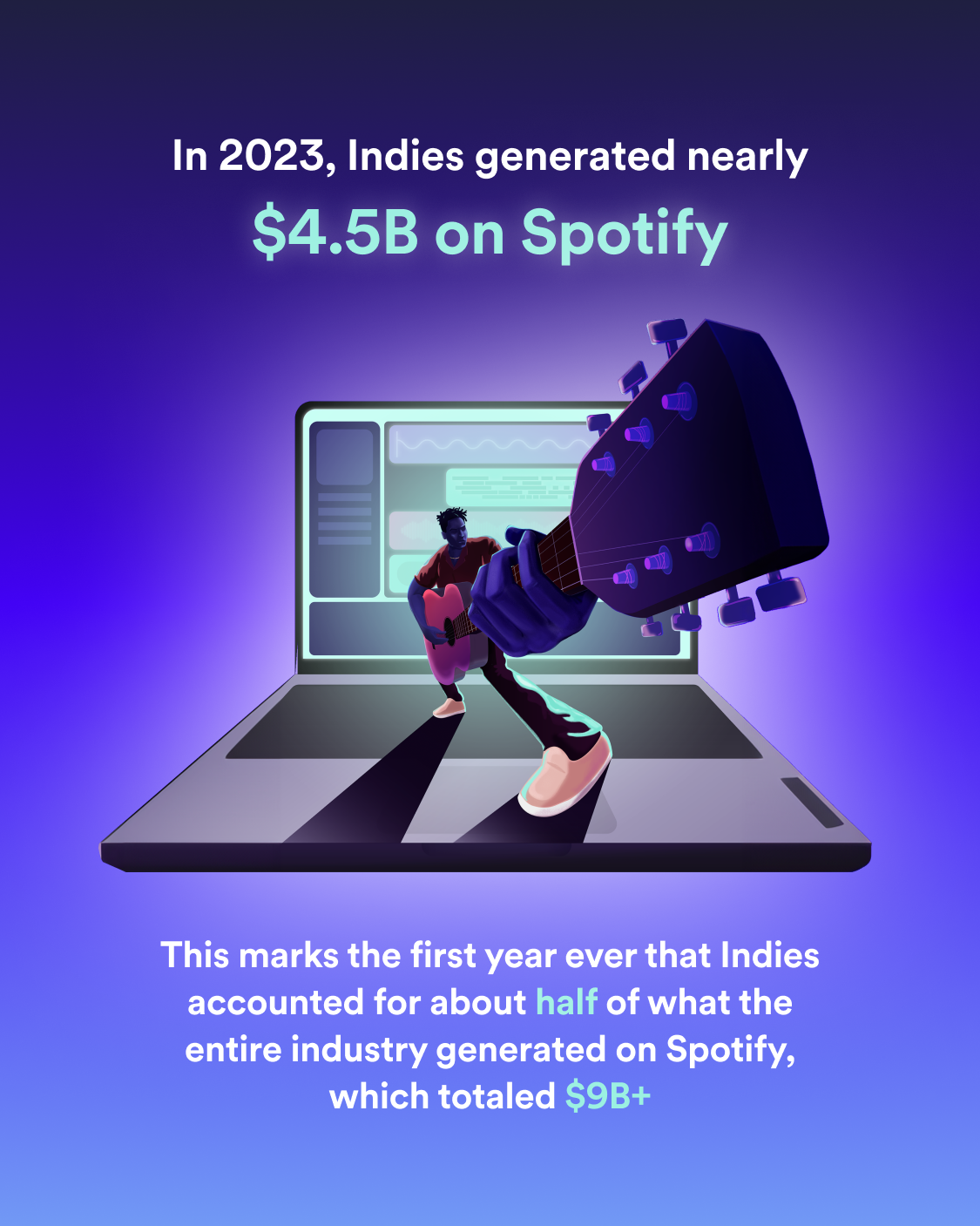 The latest data shows that the industry is less top-heavy than ever, with more artists having a true seat at the table and the ability to make money from their art. Last year Spotify raised the bar, recording the highest annual payment to the music industry from any single retailer. And for the first year ever, the catalog of DIY artists and artists signed to independent record labels accounted for about half of what the entire industry generated on Spotify in 2023.