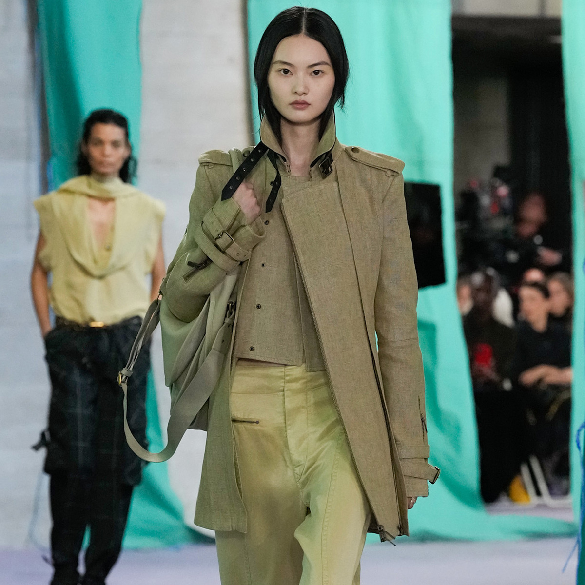 For his fourth runway collection, Lee presented a refined lineup of easy and elegant designs. While the pieces paid homage to the classic British codes of the House, they felt like a departure from what we’ve seen in the past. Rather than bold patterns and head-to-toe moody ensembles, a sense of softness and lightness was felt. There were feathers, chiffon, and ethereal color palettes of light grays, pale greens, beiges, slate blues, and even lilacs. Beyond the soothing energy, the styling felt intentional. There was an emphasis on practical and wearable outfits and the combination of evening and everyday wear—the blend you’d see on city streets. For example, upscale dresses were paired with day-to-day coats and fancy embellished tops styled with relaxed pants.