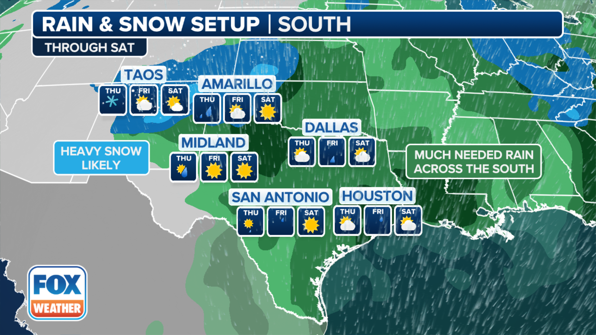 A storm moving through the south-central U.S. is bringing snow to the High Plains of Colorado and New Mexico and heavy rain elsewhere. The heaviest rain on Thursday will fall across parts of Texas, where the risk of flash flooding is elevated. That risk continues in the Lone Star State on Friday but moves east on Saturday.