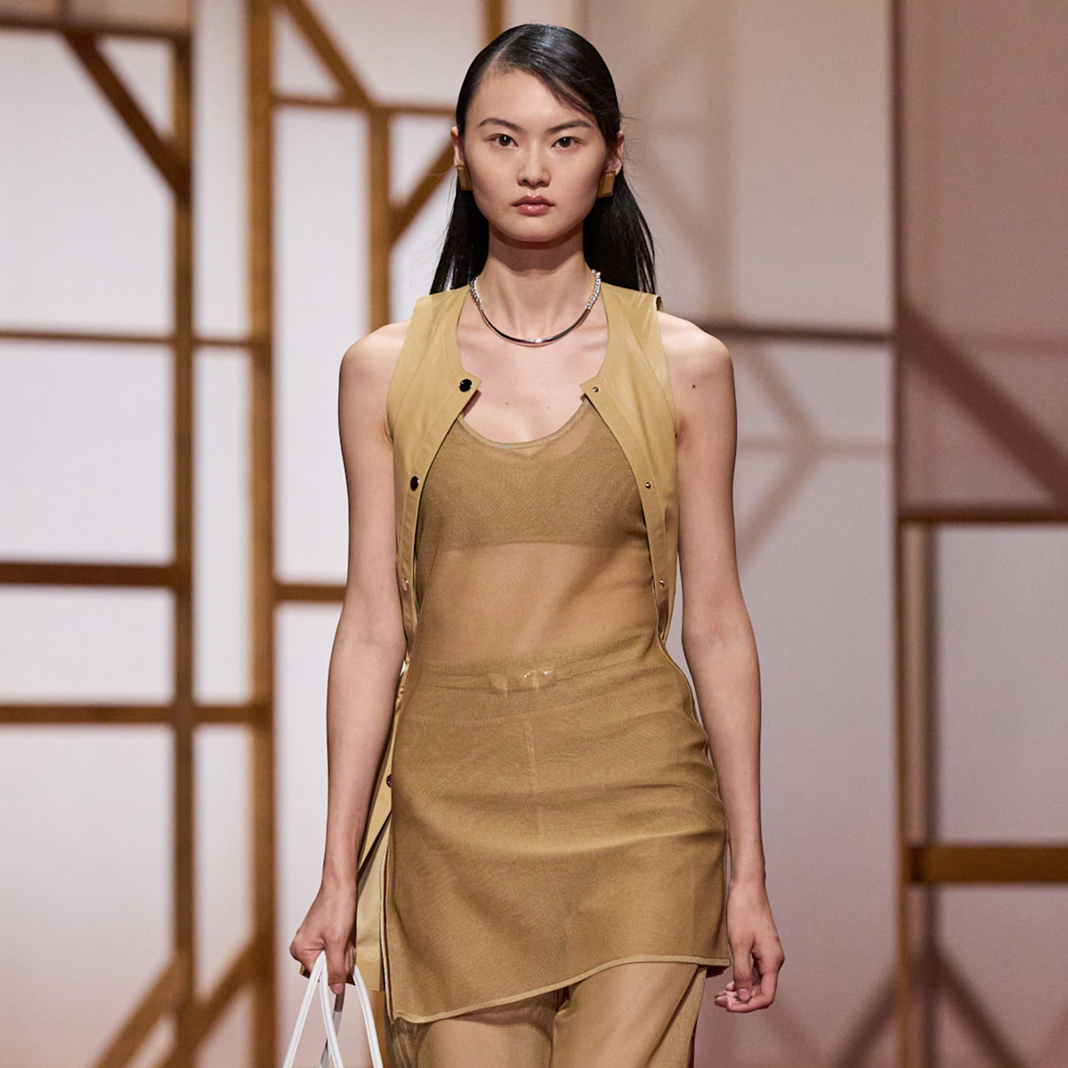 With all its history and legacy in the leather goods business, you’d expect the handbags and accessories to be the highlight of any Hermès show. This season, there was certainly no shortage of beautiful leather goods to delight in, but it was none other than the ready-to-wear that got everyone in the industry talking. The spring/summer 2025 collection was marked by sheer mesh pieces that ranged from pant sets to skirts and tunics, all expertly layered in the same shade for one tonal look.