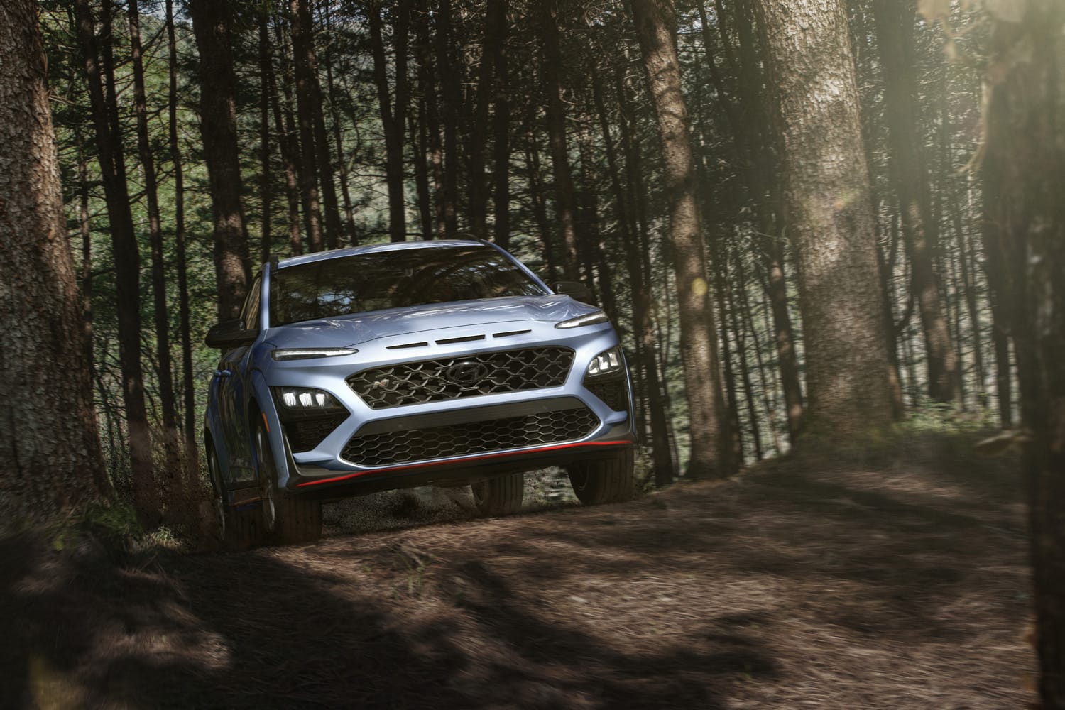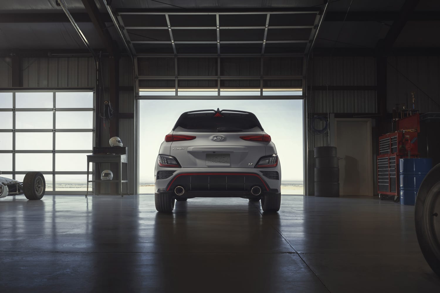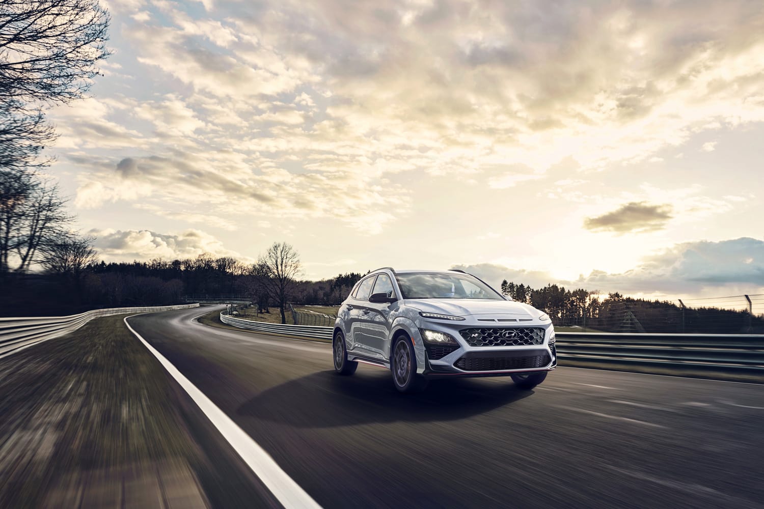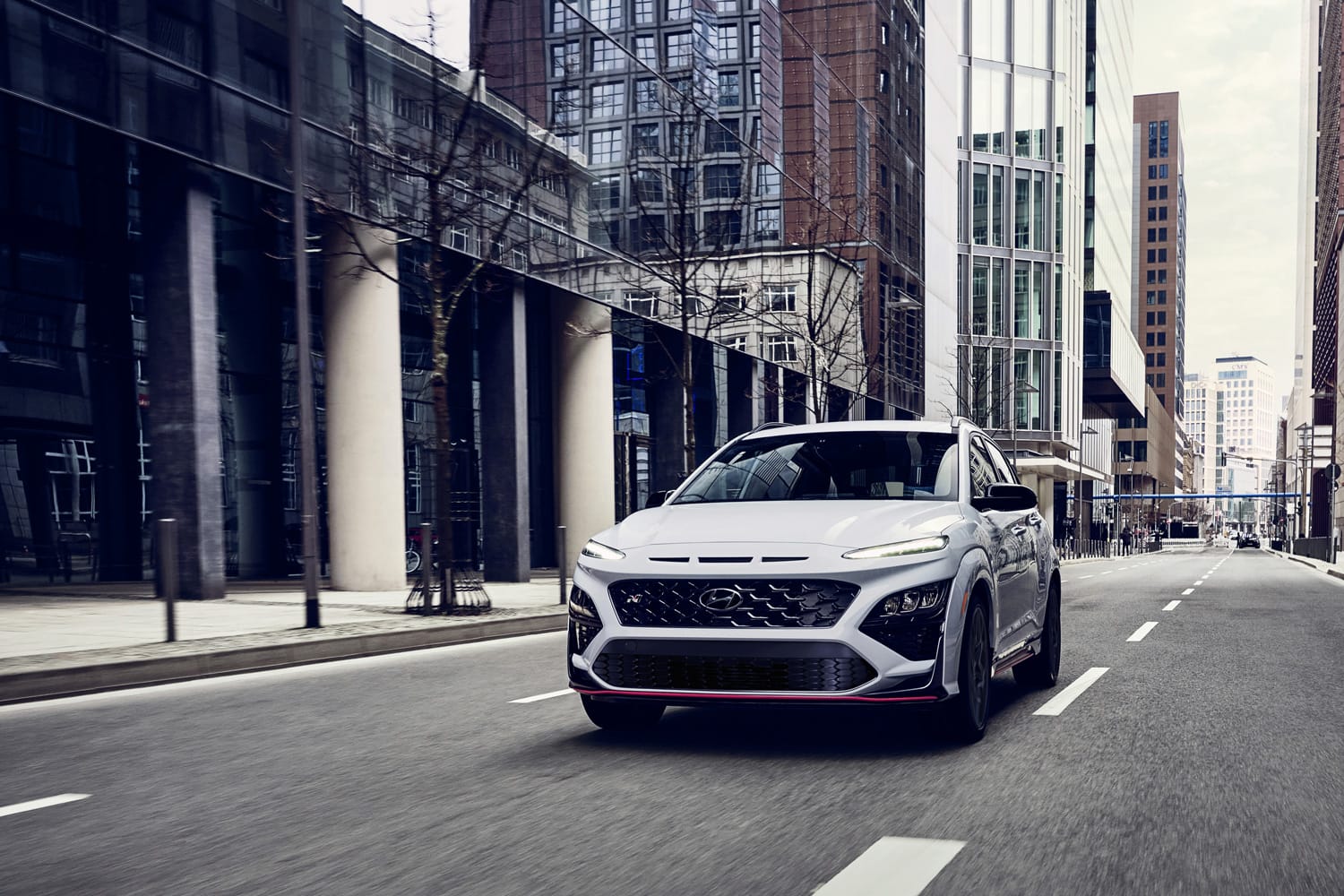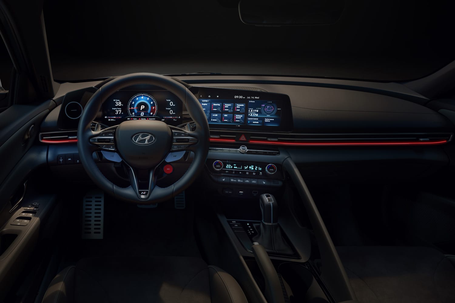 While the Elantra N and Kona N both have different design profiles, they, however, share a look that oozes confidence. The Elantra N’s aerodynamic silhouette is bold and daring — distinct lines give it a perpetual top-speed look, even at a standstill. At the front, extremely angled headlights provide an aggressive yet controlled stare, accented by the model’s blacked out grill that commands added attention. To highlight its modern, edgy identity, red line accents on the Elantra N’s lower edges give off that track-ready view race fans can appreciate. Lastly, the slim rear lights that run across the back are subtle but difficult to resist for those low-light photo ops.