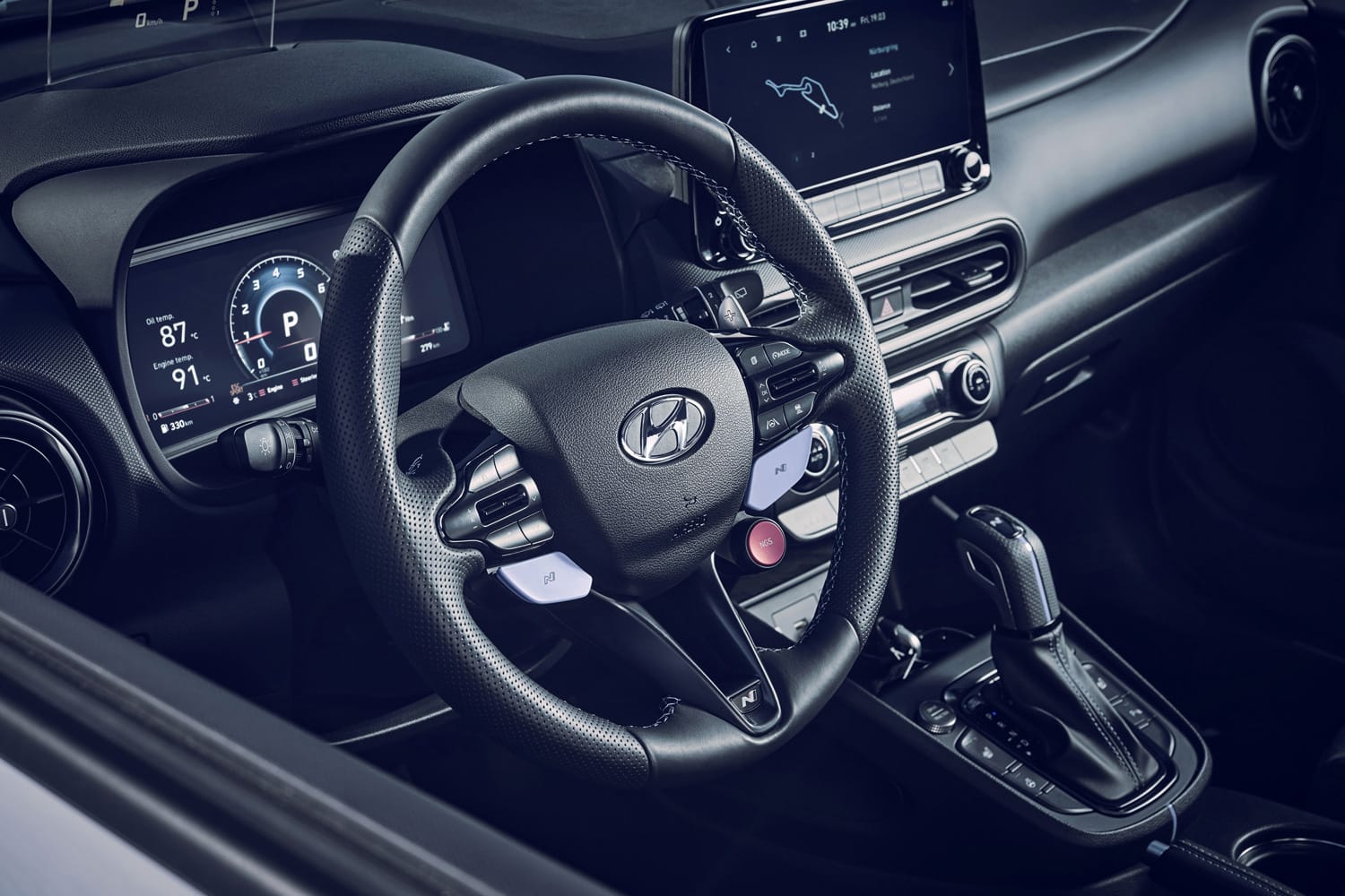The Hyundai Elantra N and Kona N both have impressive cabins and cargo space. Inside the Elantra N, steady angles and sweeping lines give a sense of seamlessness. It’s an unfussy cabin area that provides easiness for driver and passenger — everything feels streamlined even with the subtle contrast stitching and racer-inspired details. The sport bucket seats, finished in leather and suede combination seating surfaces, provide that race-ready look and feel, keeping you firm and steady for any twist and turn at high speeds. Comparatively, the Kona N induces maximum comfort with its fuss-free design. Simplicity is key for the smaller vehicle which also boasts leather and suede combination sport seats and a full 19.2 cubic feet (544 litres) of trunk storage that expands to 45.8 cubic-feet (1,296 litres) when the rear bench is folded.