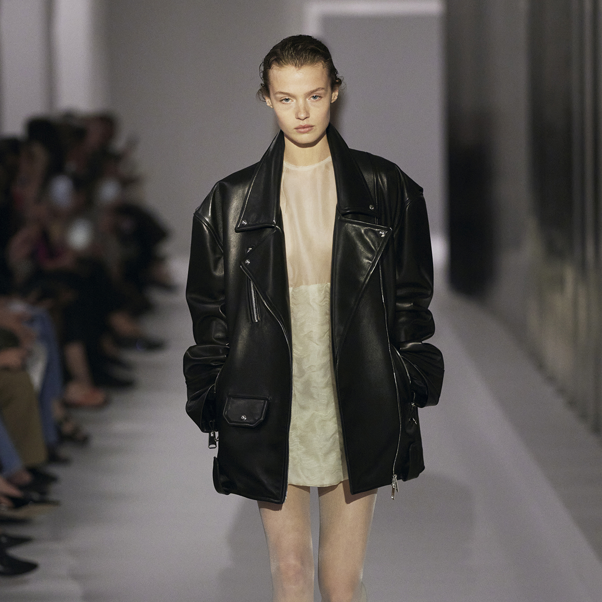While Khaite collections as a whole are usually a bit dark and edgy, this one showed the softer side of the brand, but mixed with its signature edgy elements. For instance, one of the standout themes in the collection was leather jackets of every style paired with dresses and skirts made of layers of organza. The contrasting fabrics made for a cool, unexpected combination that I’m sure the It girls in attendance at the show will be eager to try out.