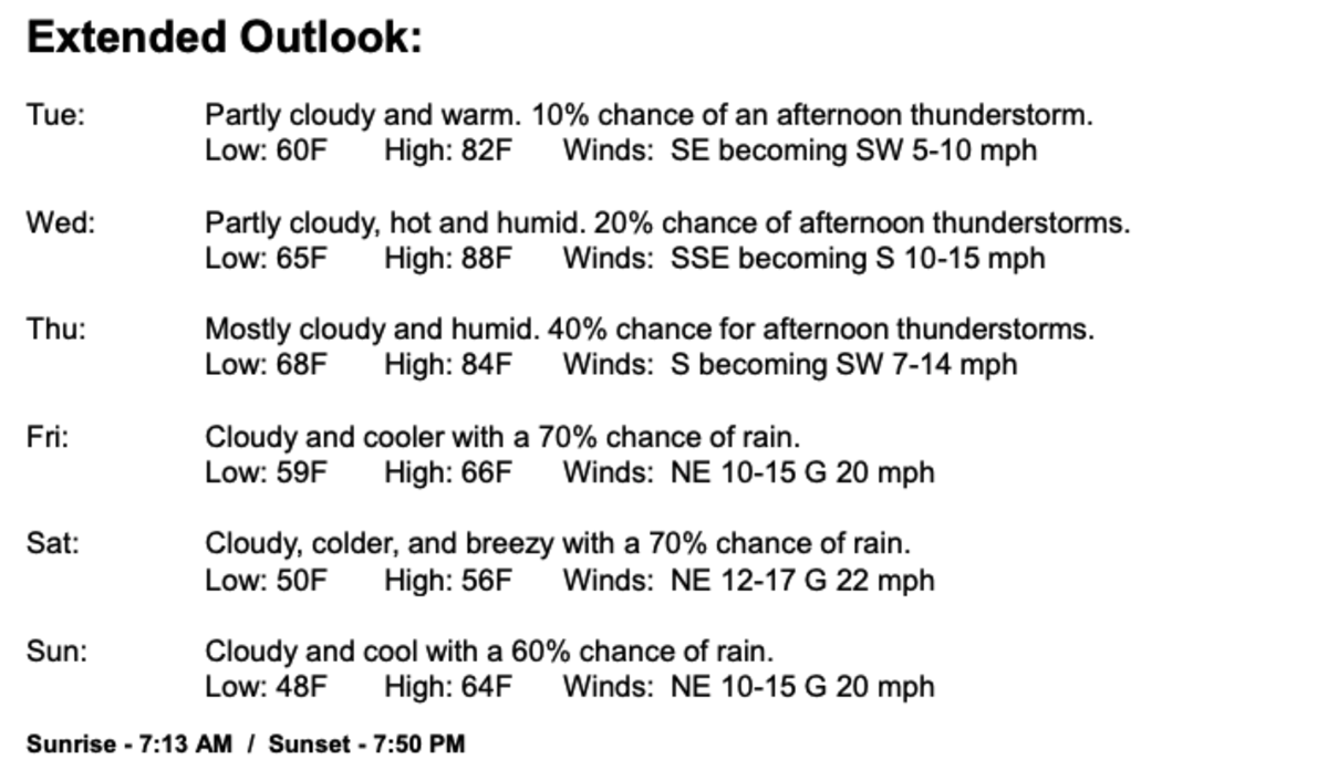 Over the weekend, the club’s forecast expects a 60-70% chance on both Saturday and Sunday, with a high of 56 degrees on Saturday. Winds will measure behind 10-17 mph, with possible 20 mph gusts.