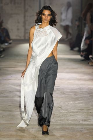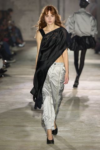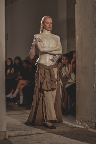 The presence of bras felt particularly prevalent—just as much as their absence. Many sheer dresses and tops were also seen on the runway with nothing worn underneath. At Rohk, a model walked out with one of the brand’s signature trenches tied around her waist, exposing the naked bust of her torso. At Duran Lantink, a viral moment featured a model strutting with a prosthetic chest that made them appear topless.