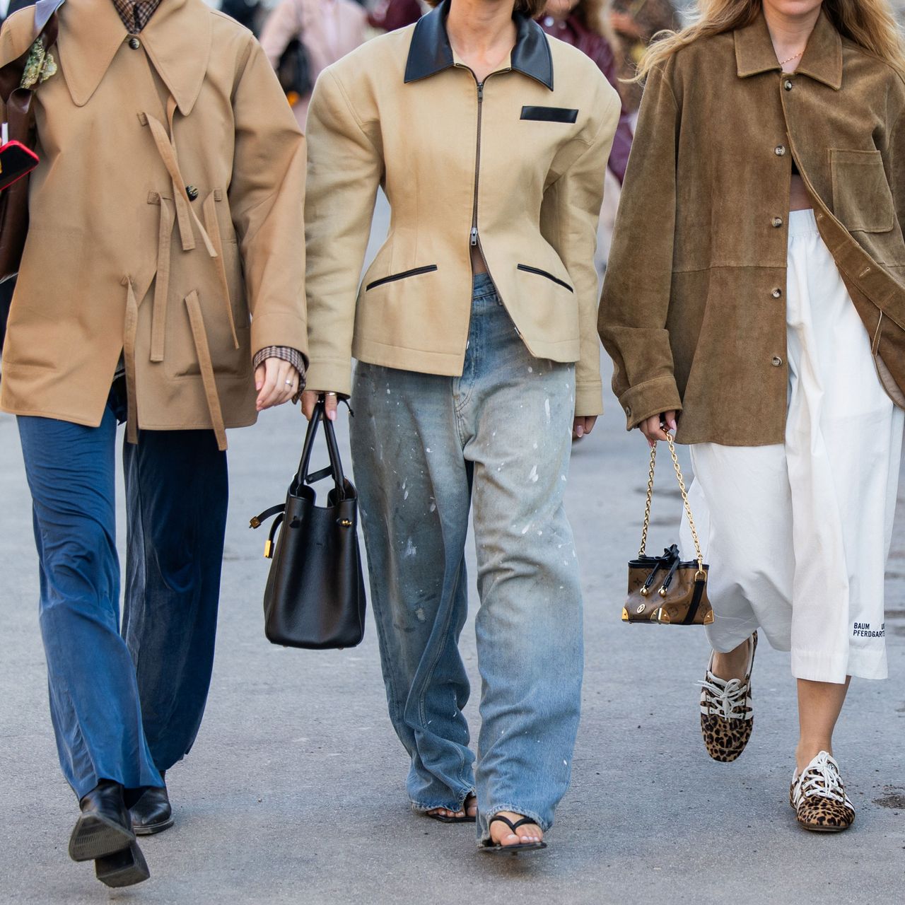 a group of three women wear different denim trends