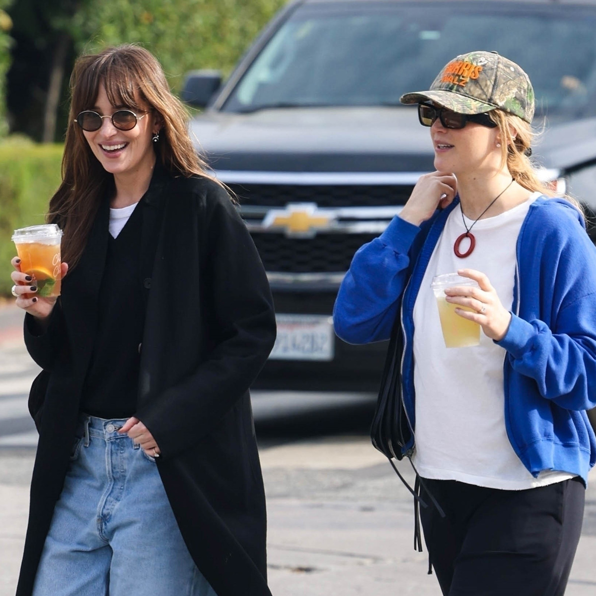 Dakota Johnson wore round sunglasses, a black sweater, white t-shirt, black coat; Jennifer Lawrence wears a camo hat, oversize sunglasses, a white t-shirt, pendant necklace, blue zip-up sweatshirt, and black sweatpants.