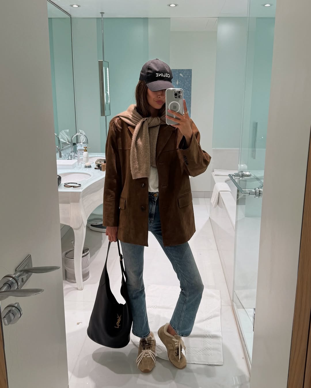 There’s almost too much mocha mousse in the photo for us to handle. From the sneakers and checkered jacket to Rhode’s peptide lip gloss, it’s a mocha mousse dream all in one frame.