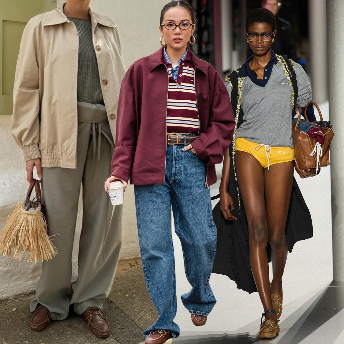 Boat shoes are taking off this season thanks to their presence on the Miu Miu S/S 24 runway, where they were styled with preppy polos, bikini bottoms, and blazers.