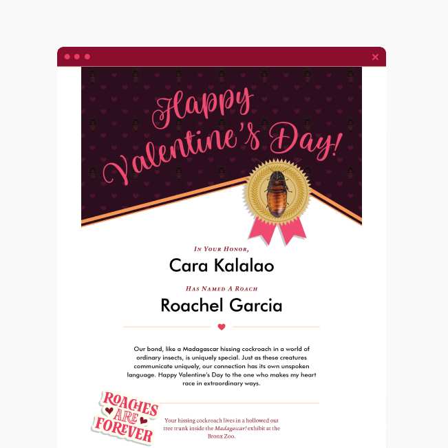Let’s face it, many of us have called roaches unsavory things, typically from a place of fear. However, if you want to redeem yourself somehow, the Bronx Zoo will let you name your very own Madagascar hissing cockroach in the name of love. You can even schedule a “virtual encounter” for your giftee, if they’re feeling up for it.