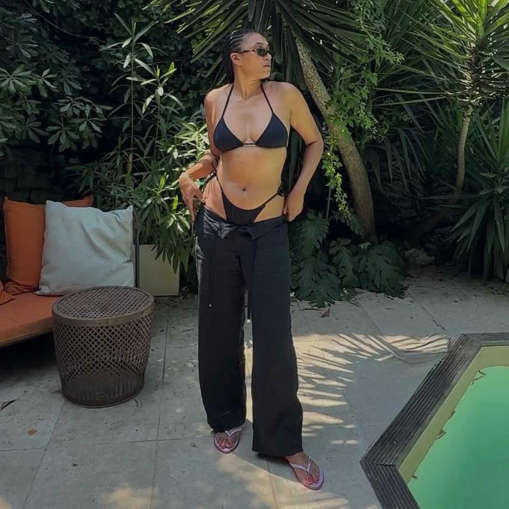 Style Notes: When spending a day at the pool, you really don’t need to overthink your look. Pair a comfortable black bikini with drawstring linen trousers for ease. Like Léna Farouil, add a splash of colour in the form of powder pink flip-flops and shades for a sugary sweet touch, to keep your otherwise all-black fit from falling flat.