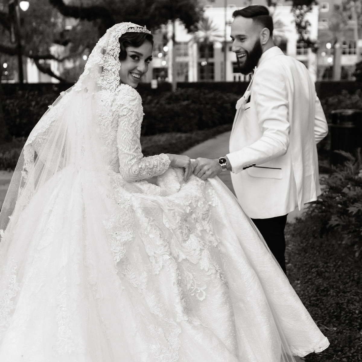 “I paid special attention to my veil, which featured an exquisite lace trim that complemented the elongated silhouette of my dress. To personalise it further, I had a phrase embroidered at the bottom in Arabic. Translated into English it reads, “He came as if he was a soul for my soul.” This quote holds deep significance for me, reflecting the beauty of our love story, its ties to destiny and how we met. It was essential to me that this meaningful quote was prominently showcased as part of my bridal ensemble.”
