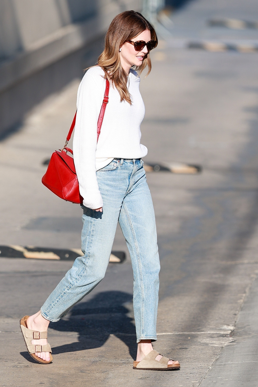 While arriving for an appearance at Jimmy Kimmel Live! last week to promote her buzzy film Drop, Fahy wore a very L.A. girl–coded outfit with her aforementioned Birkenstock suede sandals, and it’s one that you really can’t mess up: a white T-shirt, light-wash straight-leg jeans, and a red handbag (in this case, the new Loewe Featherlight Puzzle). Suede sandals look chic with a great many outfits, but Fahy’s has to be the most effortless.
