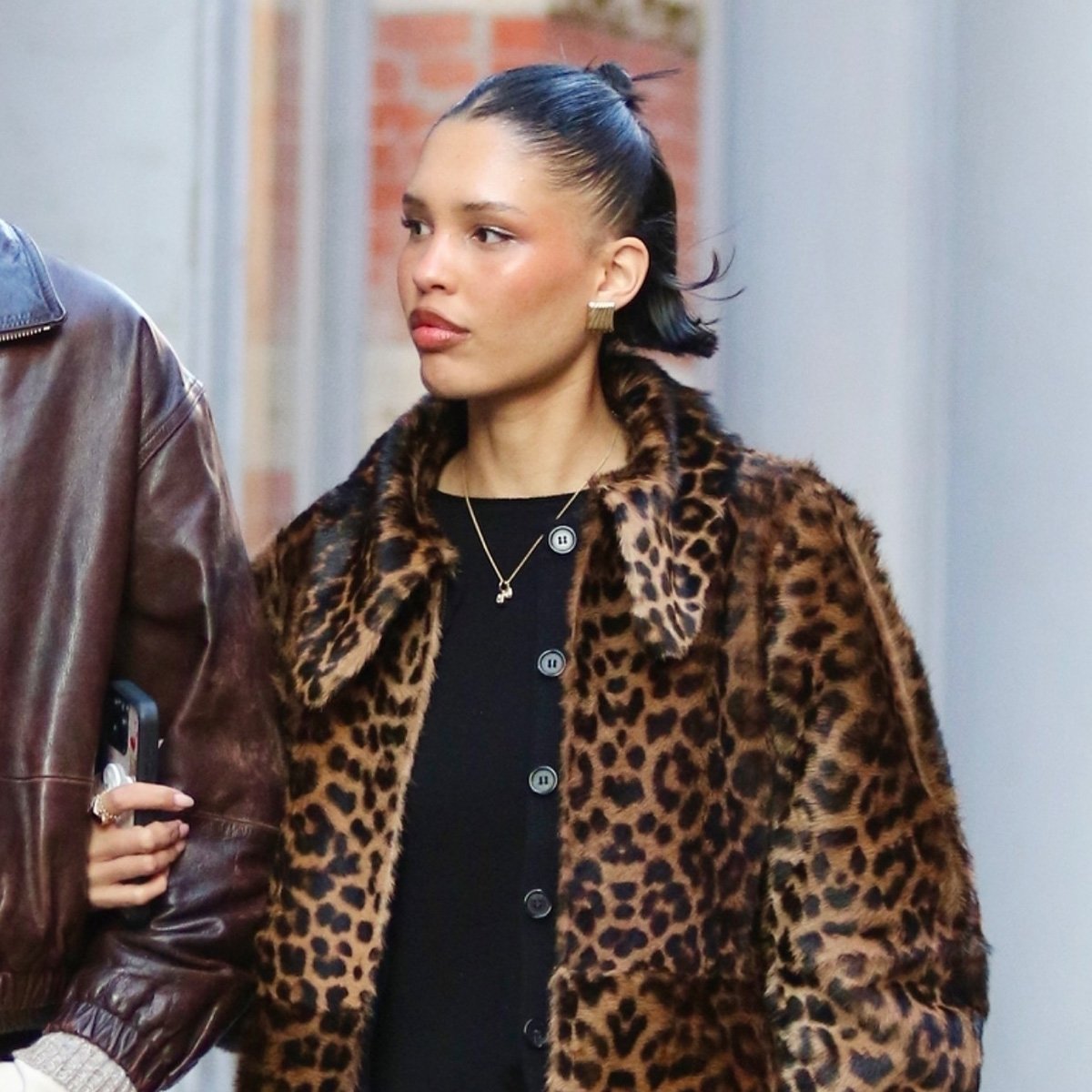 On Nara Smith: By Malene Birger Rafaia Leopard-Print Pony Hair Coat ($5000); Bottega Veneta Andiamo Intrecciato Leather Clutch ($2950); Saint Laurent Le Loafer Mocassins ($995)