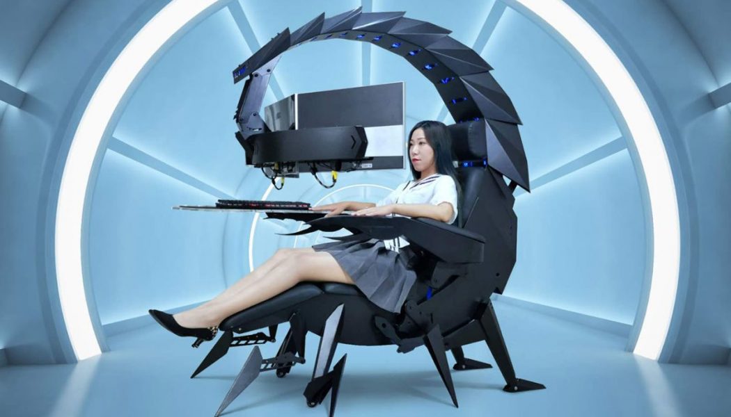The aptly named Scorpion (or, more formally, the IW-SK zero-gravity esports gaming chair and workstation) literally resembles the body of one of the poisonous little arachnids. Six legs support the 265lb chair, and the “claws” serve as arm rests and a keyboard support. To round out the design, an overhanging tail piece wraps over the user to act as a screen mount and completely enclose the user within its grasp. Cute!