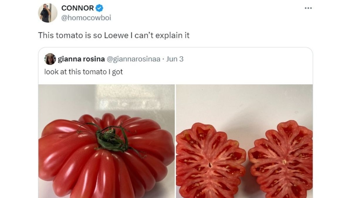 For a few days now, fashion enthusiasts have found a new obsession—Loewe’s tomato clutch. To give you context, a user on X (previously Twitter) posted a picture of a red heirloom tomato that looked rather pleasing and captioned it: “This tomato is so Loewe I can’t explain it”. The post quickly gained traction, with users expressing either their amusement or complete agreement with the uncanny resemblance the fruit shared with the brand’s aesthetic. One of the comments on the post read: “Don’t let Jonathan Anderson see this; he’s going to design a giant tomato purse that looks like that”.