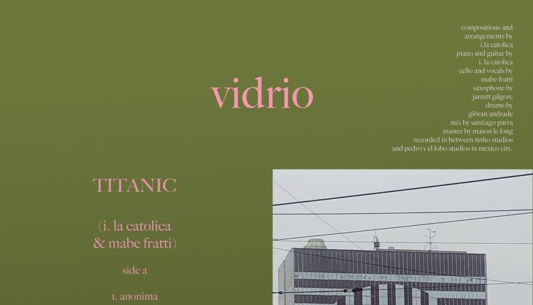 When we last heard from Mexico City-based cellist and singer Mabe Fratti, she was exploring sun-baked, sand-blasted textures on 2022’s Se Ve Desde Aquí. It was a shift from the earthy chaos of her earlier albums, where shape-shifting instruments tangled like root systems of ancient, verdant trees. This summer, Fratti announced a new project, a collaboration with her live-show linchpin Héctor Tosta, aka I. la Católica. They called it Titanic, which certainly takes nerve: Would the duo tackle Céline Dion? The much-missed Kirsty MacColl’s breathy folk-rock? Would it be camp? Would it be a disaster? Their debut album is confident in its ambitions. Vidrio cross-pollinates the spatial management Fratti has spent the past few years cultivating with Tosta’s taste for prog sprawl. The album’s title is a word for “glass.” The record is a window overlooking fertile plots of modern composition, jazz, and art song.