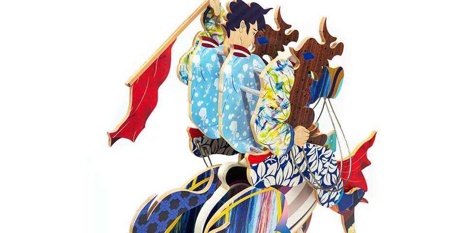 In collaboration with AllRightsReserved, Matsuyama will release his first ever wooden sculpture. In Natural Shell Pride, the artist created a warrior on horseback that carries emblems reminiscent of samurai iconography, along with the myth of the cowboy. Delicately made through wood and mixed materials, each wooden layer pops with various patterns and comes perched on an opulent pink and yellow base.