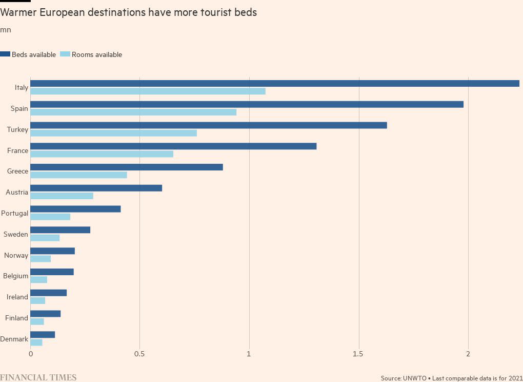 Consumer demand is not yet sufficient to warrant significant increases in capacity in cooler destinations such as the Nordics. Significantly more beds would be required. Compare tourism beds in Spain, at nearly 2mn in 2021, with Finland at under 139,000. Holidaying in Nordic countries is not cheap, either.