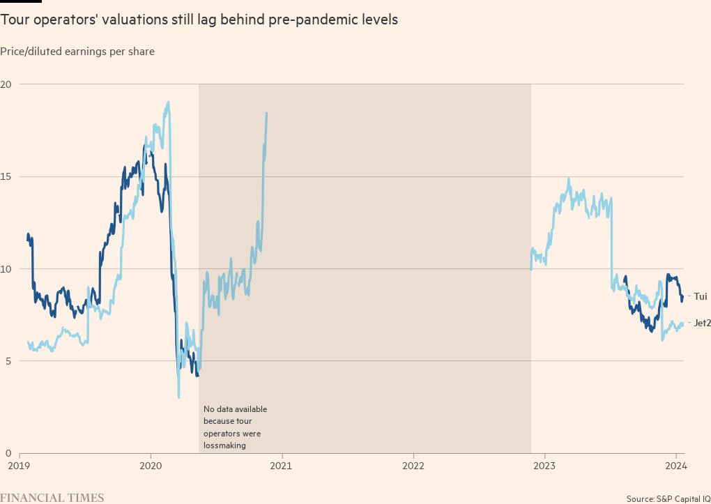 Intense heatwaves in southern Europe that regularly top 40C and wildfires such as those that raged in Greece last year are starting to affect holiday-maker plans, says the European Travel Commission. Tour operators and hotel owners will be aware of stranded asset risk if tourists shun popular destinations in the southern Mediterranean. Operator valuations remain depressed compared with pre-pandemic levels.