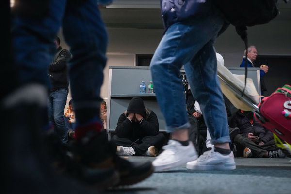 People sit on the floor at Vancouver International Airport after a snowstorm impacted operations leading to cancellations and major delays, in Richmond, B.C., on Dec. 20, 2022.DARRYL DYCK/The Canadian Press