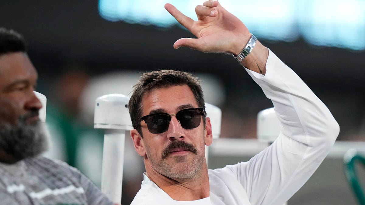 New York Jets quarterback Aaron Rodgers waves to fans before the game between the Jets and the Kansas City Chiefs at MetLife Stadium in East Rutherford, New Jersey, on Sunday. (AP Photo/Frank Franklin II)