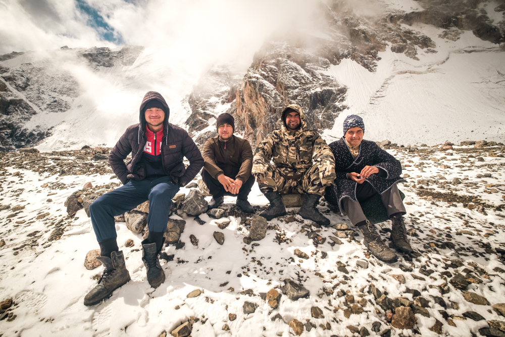 The high point of the trek comes on day six at Chimtarga Pass, a col at 4,750m connecting the summits of Chimtarga (5,489m) and Energia (5,120m). We took a rest day at Chimtarga High Camp below the pass at 4,115m when strong winds and snow blew in, keeping us inside our tents for most of the day.