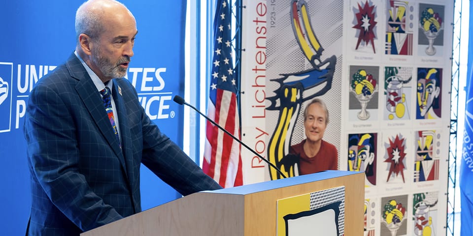 On the centennial of his birth, the U.S. Postal Service recognized the life and contributions of American artist Roy Lichtenstein with the dedication of new stamps in his honor at the Whitney Museum of American Art in New York. The Forever Stamps come in panes of 20, featuring five of the artist’s most iconic works.