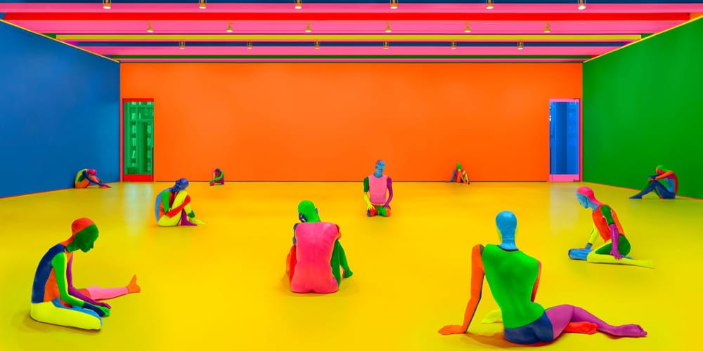 Known for his eclectic and colorful creations, Rondinone’s exhibit transforms the museum’s entire second-floor gallery space into a prismatic arena comprised of bold fluorescent hues, which creates a seamless synergy that harmonizes with the artworks within. 113 life-like sculptures of dancers appear at rest and in waiting across the space, inviting visitors to delve deeper into the show’s theme, which explores the multifaceted significance as well as the ephemeral mysticism of the rainbow.