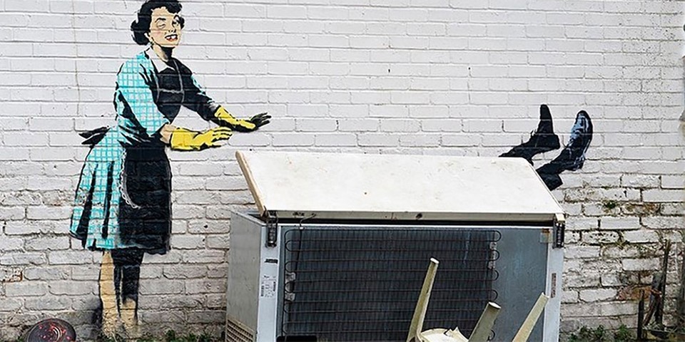 Situated in the seaside town of Margate in Kent, which is home to the Turner Contemporary gallery and artists like Tracey Emin, the new mural depicts a housewife from the 1950s who is seemingly putting her other half into a freezer bin.