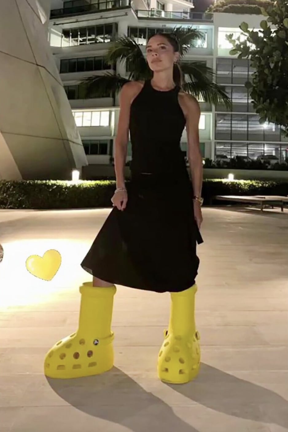 She’s known for wearing sky-high stilettos with an array of chic outfits, but Victoria Beckham mixed up her wardrobe on 25 July by rocking the very divisive MSCHF x Crocs big yellow boots. The fashion designer posted a snap of her wearing a minimalist black midi dress on Instagram stories, with her hair scooped into a low ponytail and the comical larger-than-life footwear on her feet.