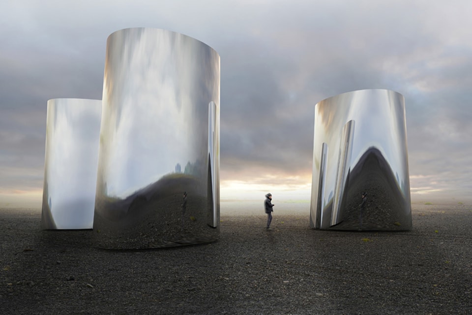 Three large polymirror monoliths blend into the picturesque environment — both reflecting and transforming it. As referenced in the title, the sculptures produce an inverted anamorphosis effect by endlessly expanding the natural world in a hypnotic display that continues to explore Leroy’s dialogue between art and nature.
