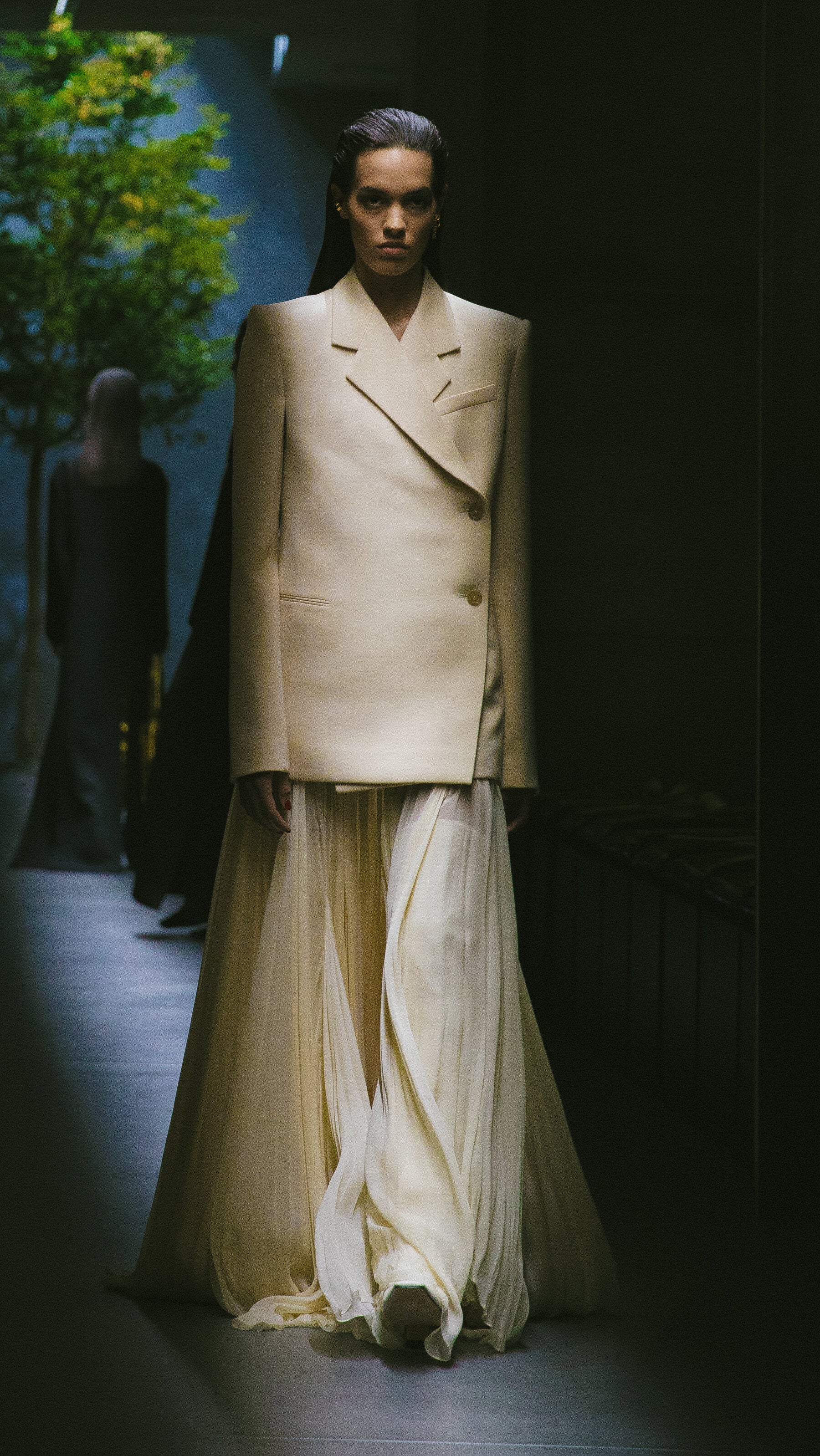 One of those looks, as presented at Khaite’s runway show, was an oversize blazer worn over a long sheer chiffon skirt, streamlined and stiff on top, swishy and sexy on the bottom.