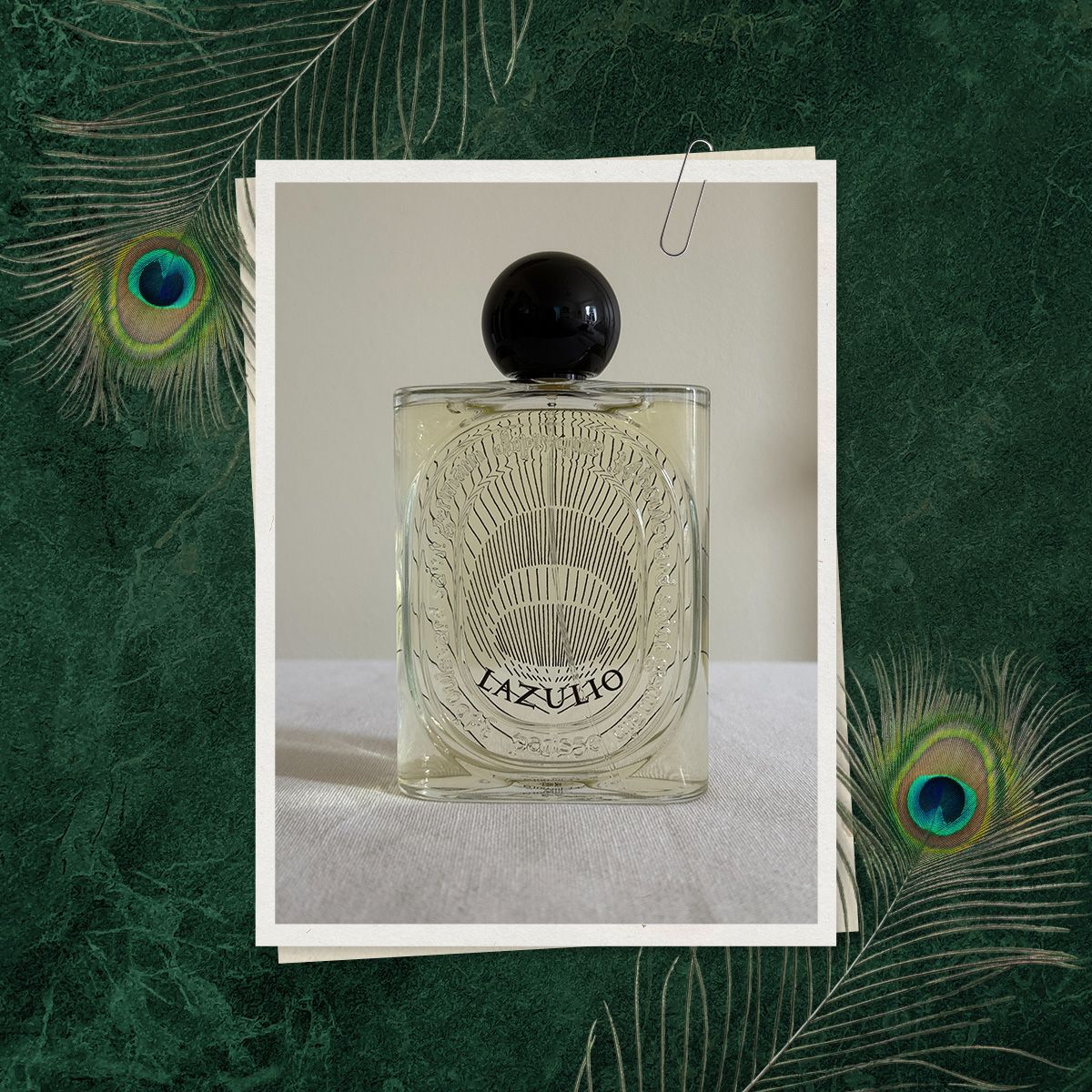The first thing I admired about Lazulio before smelling it for the first time was that its box—decorated with vibrant blue hues—looks beautiful next to the golden color of the perfume. Placed side-by-side, I saw an undeniable representation of a peacock feather. Running my hands gently along the transparent glass bottle, I studied the brush strokes created by Peake to resemble the soft, fluffy parts of a feather before noticing the collection’s signature knob-like, black cap.