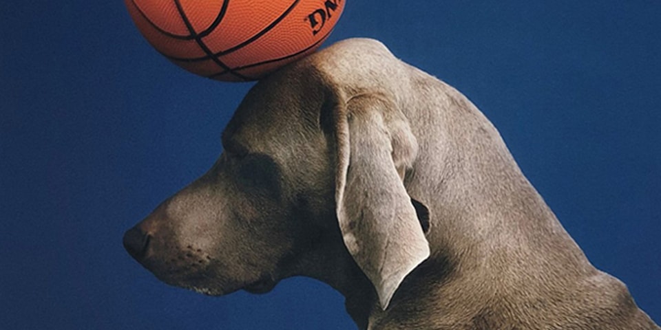 Emblematic of his past work, a stoic Weimaraner poses to a blue backdrop and a vibrant orange basketball frozen in a seemingly impossible manner atop its head. More than just a cheeky nod, Wegman showcases his dogs as a way to study composition and color. Each of his portraits depicts a canine subject as both classical sculpture and iconic portrait.