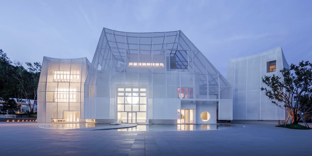 Wutopia Lab’s ‘Flickering Peak’ is a playful convergence of light and space. The architectural project was completed in Coffee Village, Hainan, reimagining the Sun River Art Center into ‘three mountains and a sea’, a loose translation from a classical Taoist story. The central and auxiliary buildings of the art center, cloaked in a white semi-transparent facade, create three peaks in the distance. Situated at the heart of the island, an artificial sea cradles the entrance of the art center to satiate the desire for an ocean view.