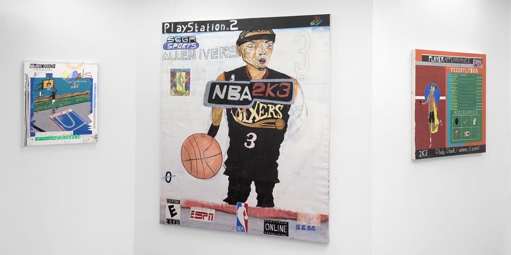 From the Iverson-clad cover art for the NBA 2K3, Playstation 2 game to the canvas-based exhibition title, the artist evokes an alluring strangeness in this realm of elongated limbs and off-kilter proportions. “It’s hard to tell whether these anatomical oddities are the result of Slaps’ style or if they are faithful representations of characters who are, both literally and metaphorically, larger than life,” the gallery wrote in a recent statement.