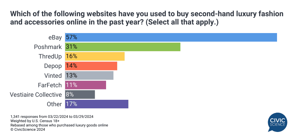 With increased interest in online thrifting in recent years (especially among Gen Z), it’s clear that some consumers are looking for more efficient thrifting methods. CivicScience data show 37% of consumers report they have purchased second-hand luxury goods online. Among online second-hand retailers, eBay reigns supreme in the resale of luxury fashion – 57% of those who have bought second-hand luxury fashion in the last year made purchases from eBay, followed by 31% who have purchased from Poshmark.