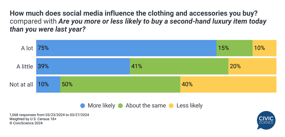 In addition, social media users show far greater interest in second-hand luxury fashion. The ties between TikTok users and thrifting have already been examined, but new polling data reveal a connection between social media and the second-hand luxury fashion market. Seventy-five percent of respondents who are influenced ‘a lot’ by fashion seen on social media also indicated they were more likely to purchase second-hand luxury fashion today than they were last year, compared to only 9% of those who are ‘not at all’ influenced by fashion seen on social media.