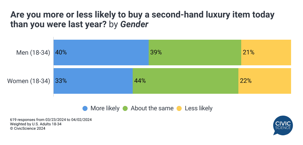Shopping for clothes second-hand has become a popular pursuit in recent years, especially among consumers who want to get more bang for their buck, hunt for vintage finds, or reduce their environmental footprint. Although many consumers enjoy the deals they find while thrifting, this phenomenon isn’t unique to discount-hunters. The luxury fashion resale industry is now worth close to $50 billion, and ongoing CivicScience polling data show that close to 35% of U.S. adults are at least ‘somewhat’ likely to purchase second-hand luxury fashion and/or accessories in the next 30 days (n=2,140 responses from 3/22/24-4/2/24).