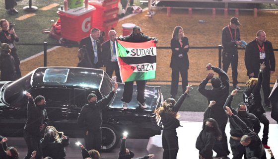 During the halftime show, something unexpected happened when one of the performers ran across the field waving a flag that said “Sudan and Free Gaza.” Security and police quickly stepped in and stopped the man after he refused to follow their orders.